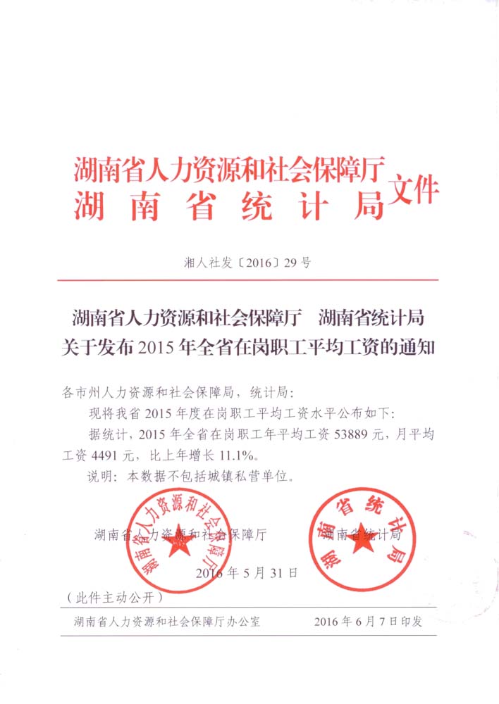 湖南省人力資源和社會保障廳,湖南省統(tǒng)計局關(guān)于發(fā)布2015年全省在崗職工平均工資的通知