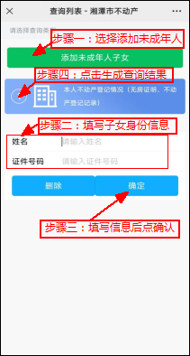 ⑸. 如需添加未成年人請點擊“添加未成年子女”后輸入身份信息并點擊確認,再點擊“本人不動產(chǎn)登記情況”